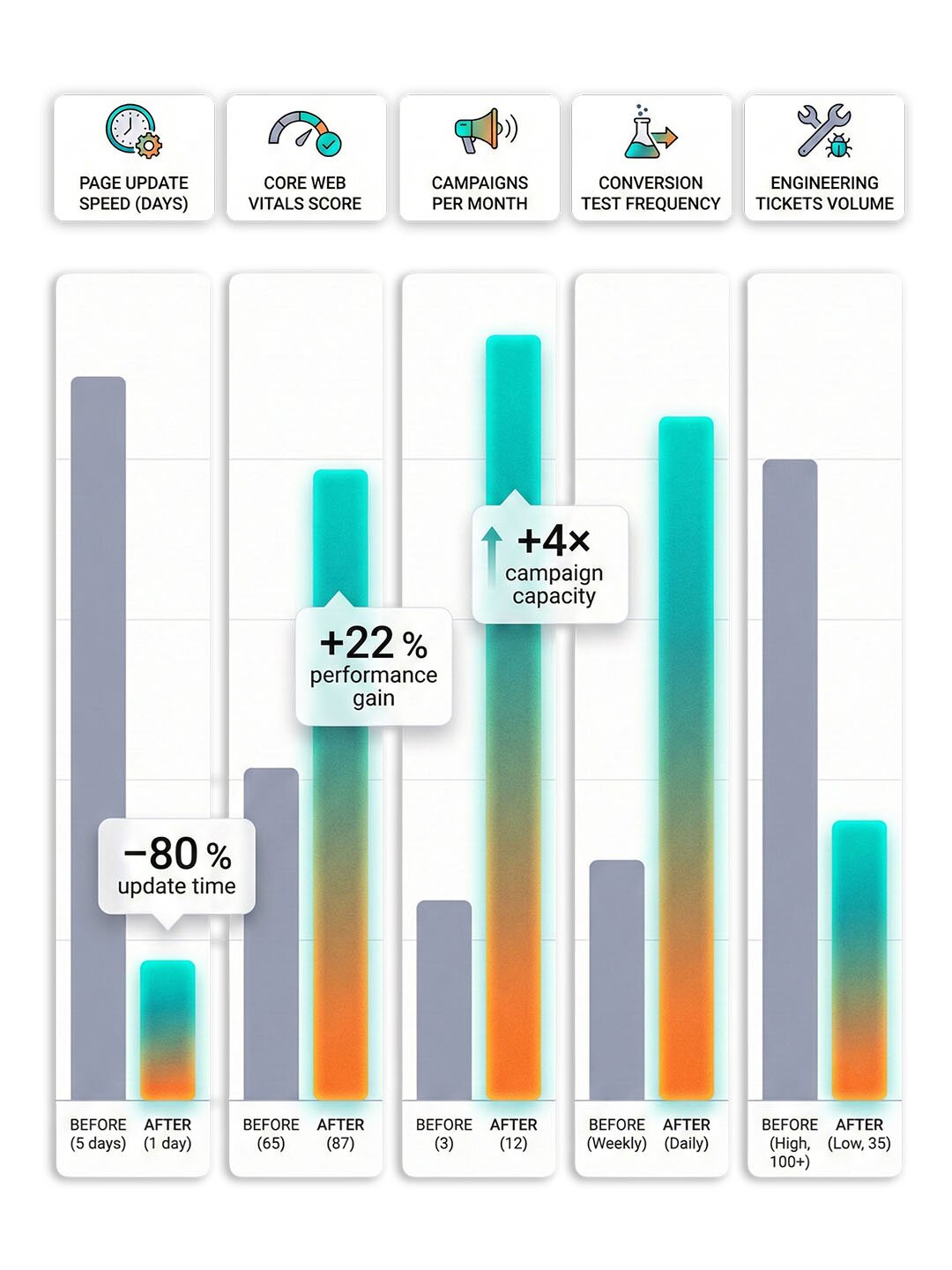 Better ops means A/B testing, CRO, and SEO changes actually ship. Pages evolve from static brochures into living testing environments.